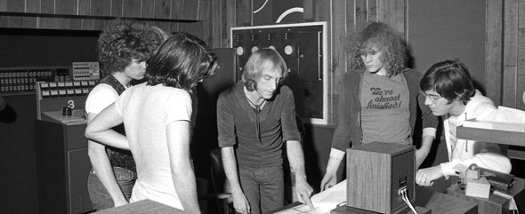TheReggie Knighton Band collaborating with John Sebastian on the animated film score for The Devil and Daniel Mouse circa 1979. L to R: Glenn Symmonds, Reggie Knighton, Clive Smith, Kurtis Teel and John Sebastian. Brian Ray was also present but not in this photo.